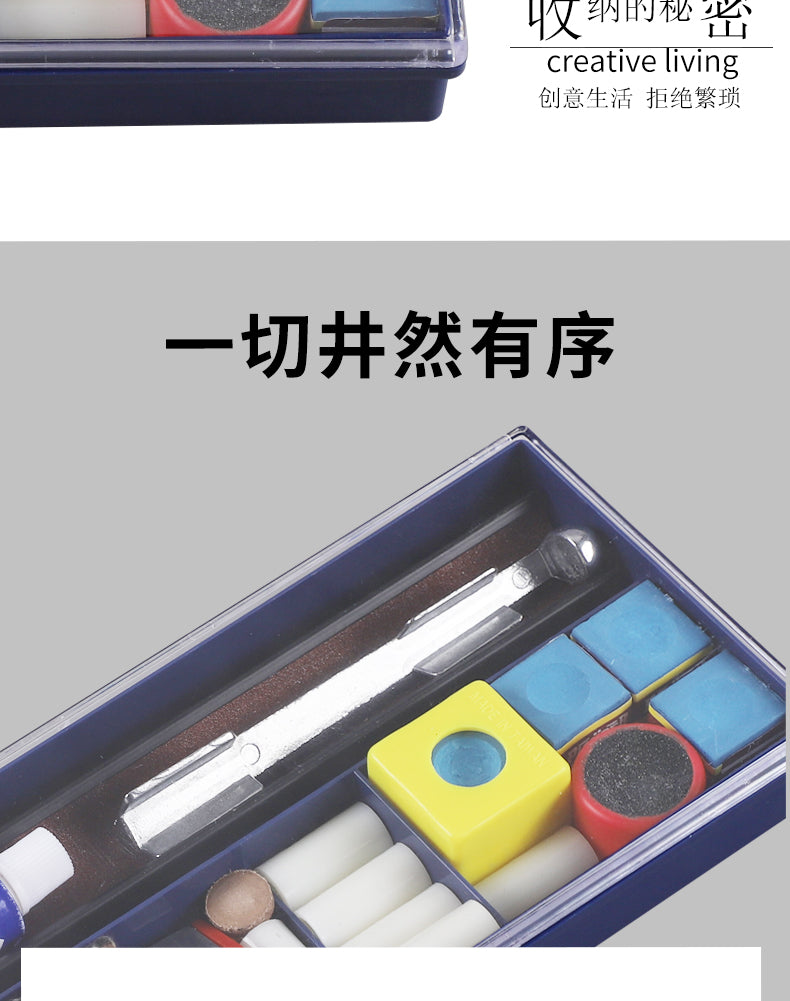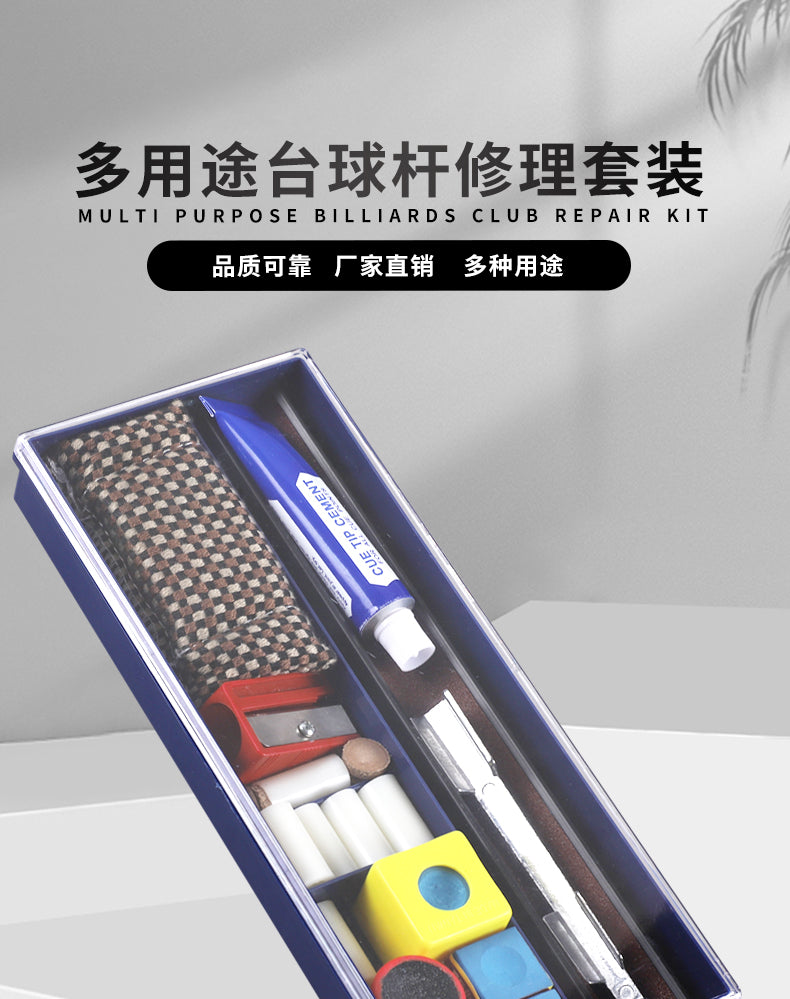 Everything in Order - Professional-grade billiard cue maintenance kit with transparent storage case. All tools are clearly visible and easy to carry and store.